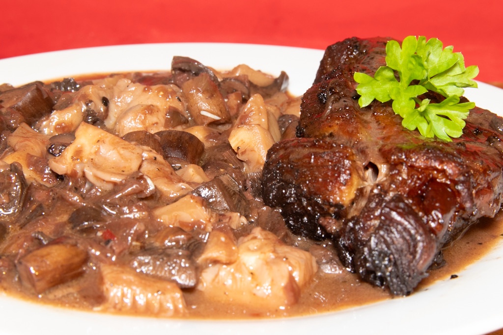 Die Putenoberkeule ist nach 2-stündigem Schmoren im Bräter in Rotwein-Sauce butterzart und zerfällt von alleine.