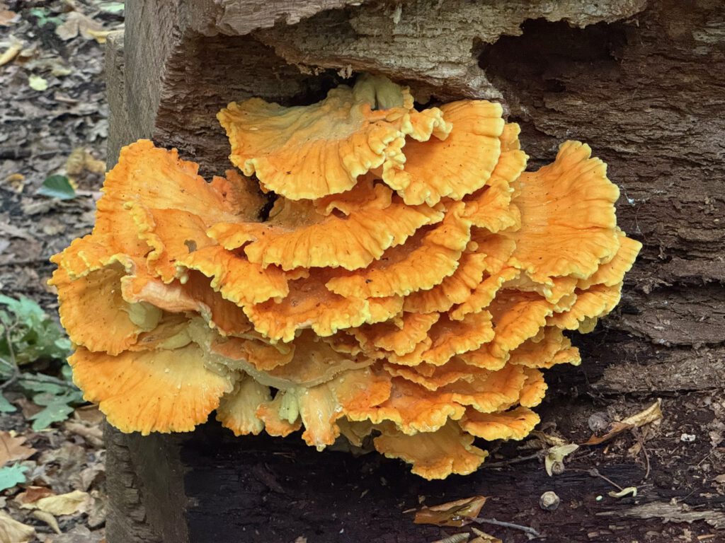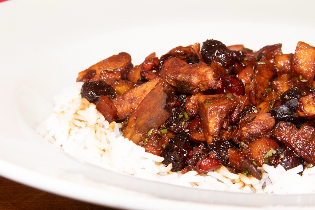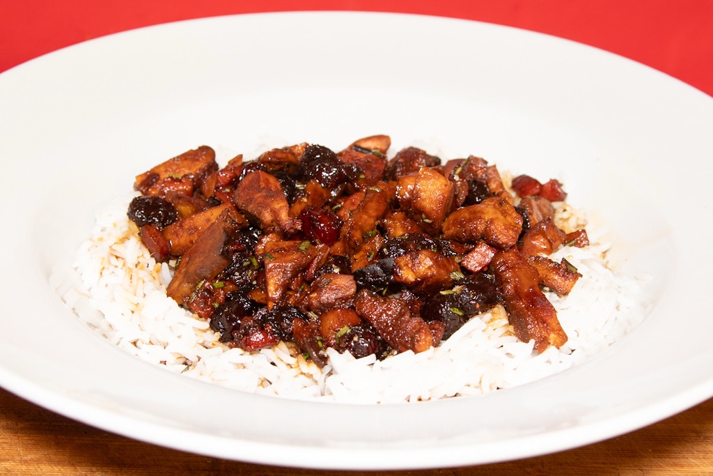 Schwefelporling hat den Beinamen „Chicken of the woods“. Und er schmeckt auch leicht nach Hähnchenfleisch, auch seine Konsistenz ist ähnlich. In diesem Gericht ist er der Hauptakteur. Der Speck liefert Würze und Salzigkeit, die in Cognac eingelegten Cranberries eine angenehme Süße und der frische Rosmarin eine krautige Note. Die würzige, dunkle Sojasauce rundet dies alles zusammen ab. Dazu Basmatireis.