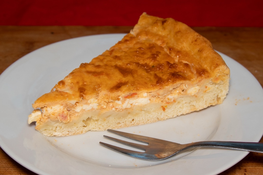 Diese Tarte bekommt einen Hefeteig, da es eine herzhafte und pikante Tarte wird. Denn für die Füllmasse, also den Eierstich, wird ein Glas Gemüse-Brotaufstrich mit kräftiger Paprikanote zweckentfremdet und in diesen eingerührt. Des Weiteren kommen kleingeschnittener Schafskäse und Burrata in die Füllmasse. Der flüssige Anteil der Burrata, also der weiche Kern des Käses, kommt zu der Sahne, die für den Eierstich Royale verwendet wird, ansonsten besteht die Gefahr, dass der Eierstich zu sehr verwässert wird. Alles in allem eine sehr leckere, schmackhafte und käsige Tarte!