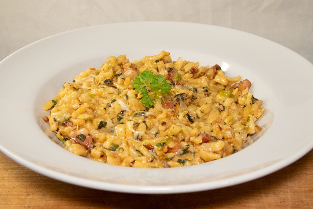Dazu Speck, Gemüse und frische Kräuter wie Salbei und Petersilie. Als Käse für die Spätzle dieses Mal Mozzarella, der gut verläuft und beim Essen schöne Käsefäden zieht.
