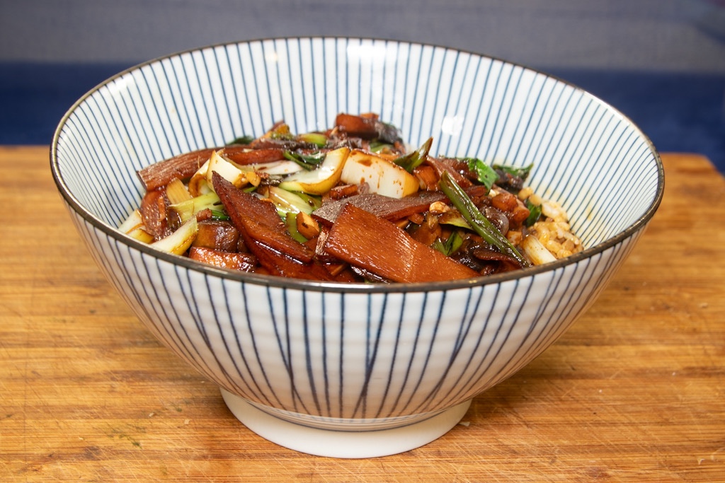 Als weiteres kommt viel Gemüse in das Gericht, dazu einige braune Champignons. Und das war’s dann auch schon.