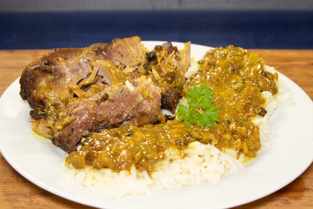 Auflaufform aus dem Backofen nehmen. Soße abschmecken. Keule herausnehmen, Knochen entfernen, Keule in Scheiben schneiden und auf die beiden Teller verteilen. Großzügig Soße über Reis und Keule verteilen.