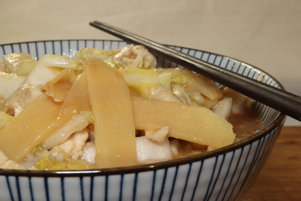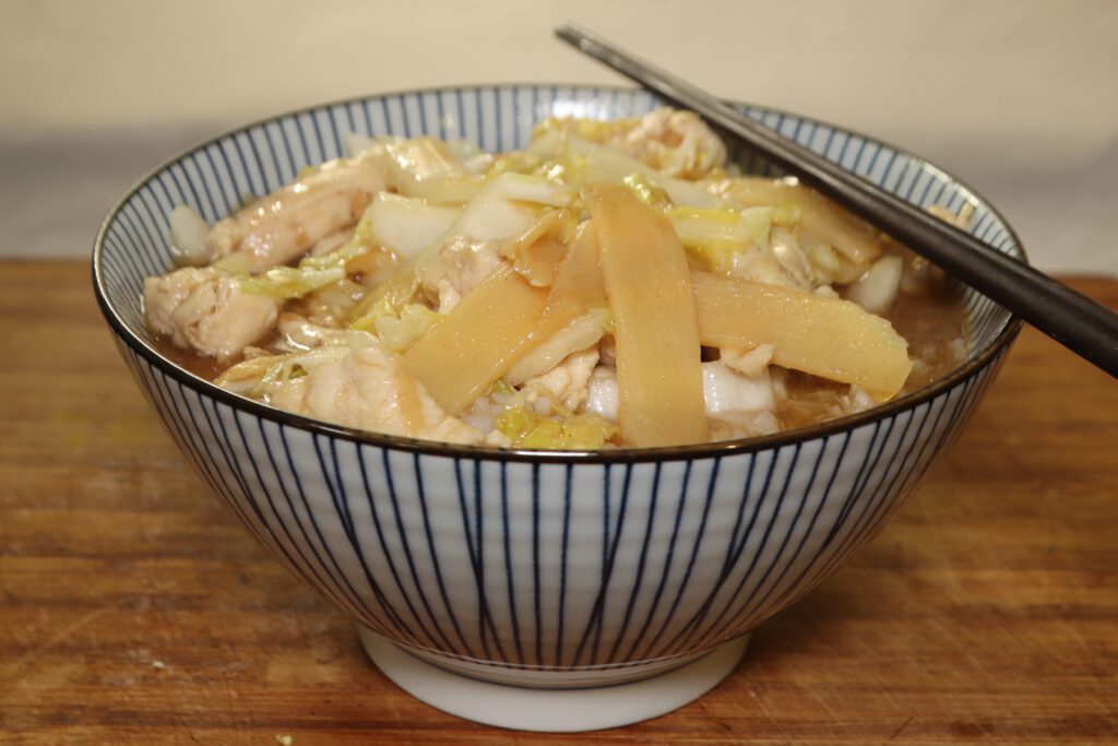 Eine asiatischenZusammenstellung. Frisches Putenbrustfilet. Dazu Chinakohl. Und Bambussprossenscheiben aus dem Glas. Die Soße wird aus einer Char-Siu-Soße, einer chinesischen Barbecue-Marinade, gebildet und mit der gleichen Menge Wasser verlängert. Dazu Langkornreis. Gegessen wird aus Reisbowls mit Stäbchen.
