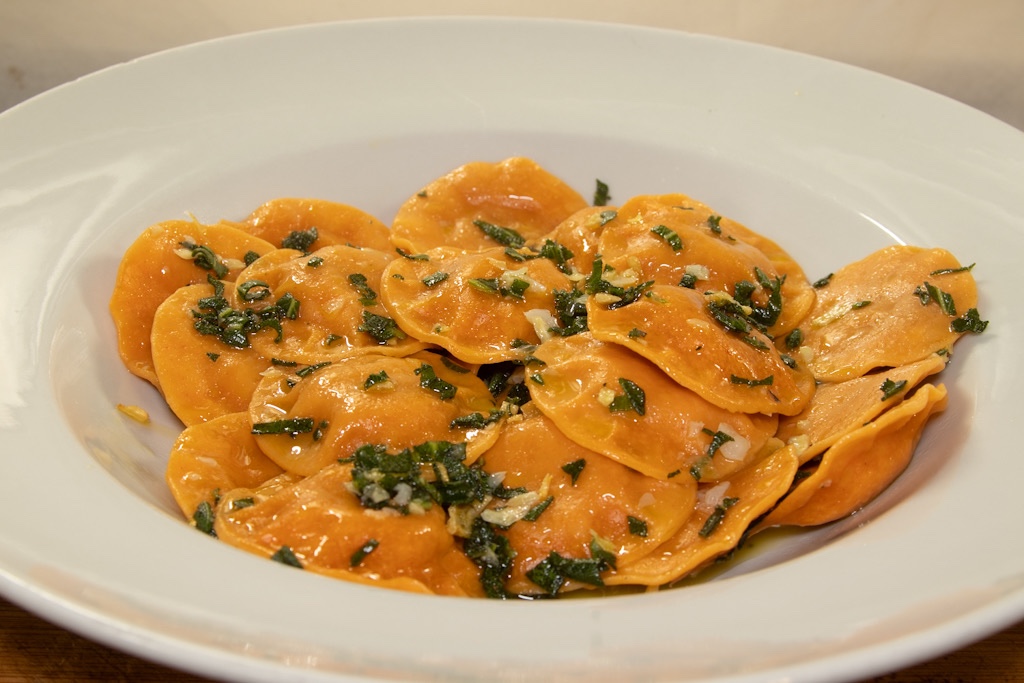 Agnolotti auf zwei tiefe Pastateller verteilen. Servieren. Guten Appetit!
