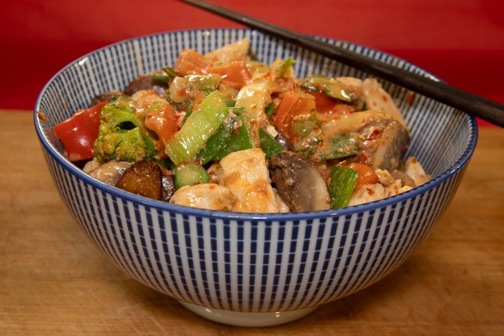 Hühnchenbrustfilet bietet sich auch immer für eine asiatische Zubereitung an. Dazu kommen verschiedenen Gemüsesorten, die man zuhause vorrätig hat. Und idealerweise eine fertige, asiatische Soße aus dem Glas, die man im Asiashop kauft. Dazu Basmatireis oder auch Langkornreis. Fertig ist eine leckere Reisbowl.
