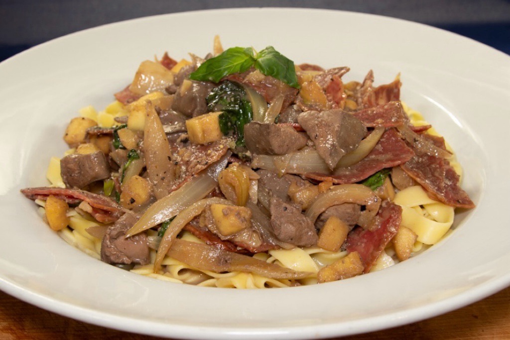 Leber mit den anderen Zutaten auf die Tagliatelle geben. Großzügig die Soße darüber verteilen. Servieren. Guten Appetit!