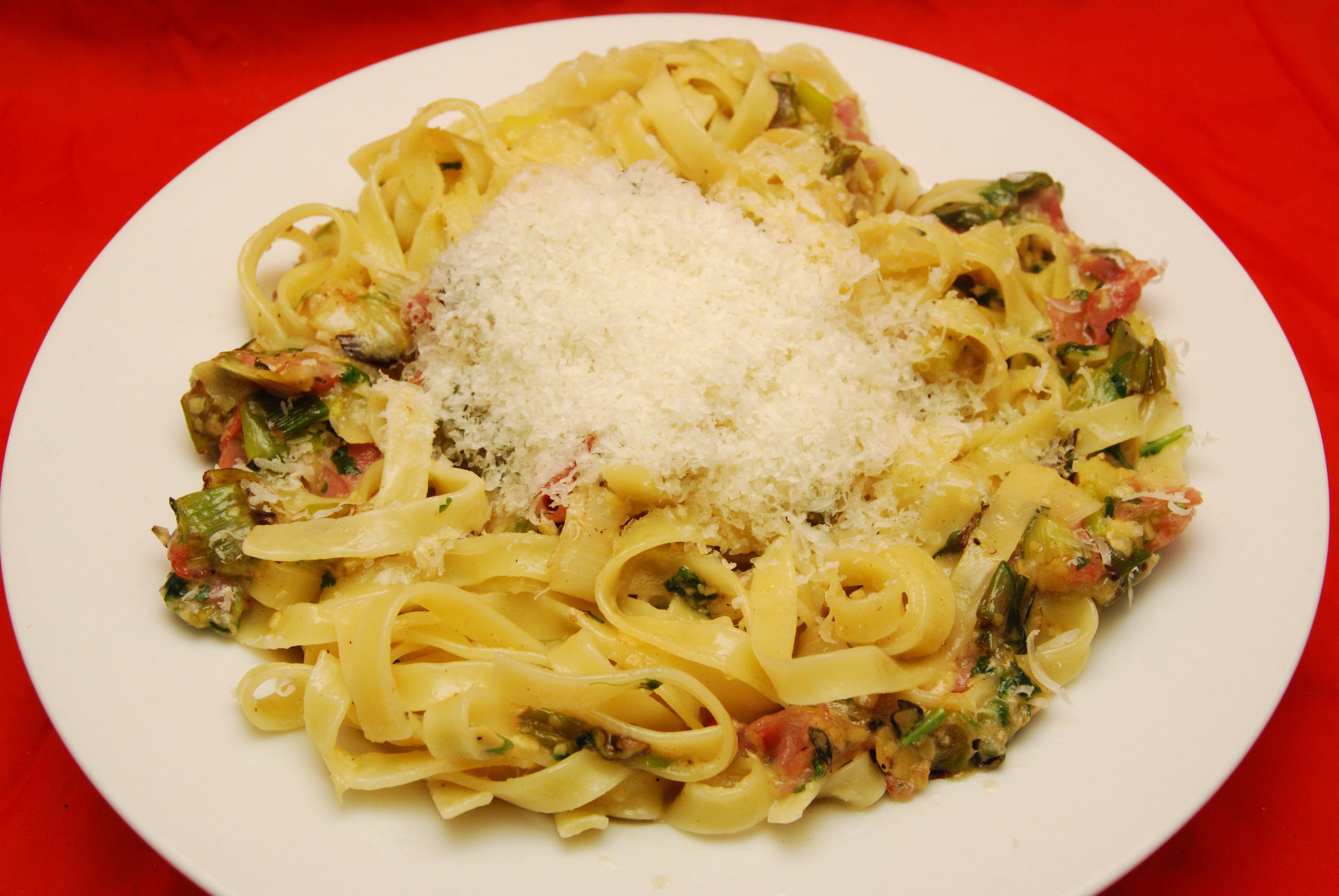 Umwickelte Hähnchenbrust mit Tagliatelle in Weißwein-Sauce